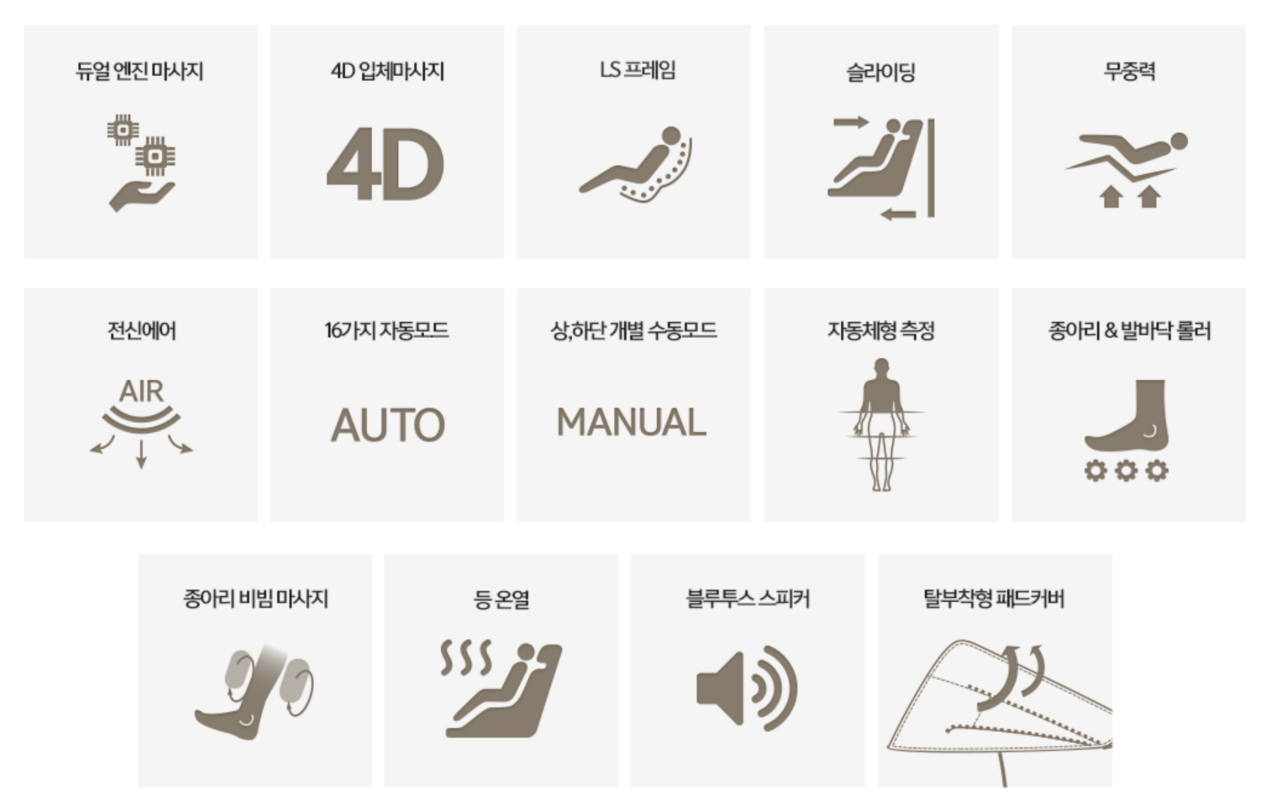 듀얼 엔진 마사지, 4D 입체마사지, LS프레임, 슬라이딩, 무중력, 전신에어, 16가지 자동모드, 상하단 개별 수동모드, 자동체형 측정, 종아리 발바닥 롤러, 종아리 비빔 마사지, 등 온열, 블루투스 스피커, 탈 부착형 패드커버 등이 가능합니다.